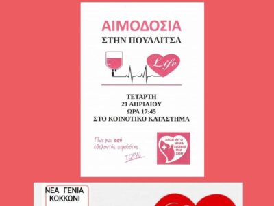 Εθελοντική αιμοδοσία στις κοινότητες του Δήμου μας 19 Απριλίου κοινότητα Χαλκείου(δημοτικό σχολείο) 21 Απριλίου στις κοινότητες Κοκκωνίου (κοινοτικό κατάστημα)& Πουλίτσας (κοινοτικό κατάστημα)