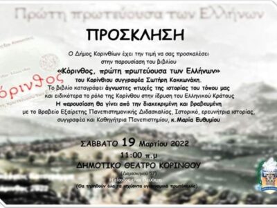 Ο Δήμος Κορινθίων έχει την τιμή να σας προσκαλέσει στην παρουσίαση του βιβλίου «Κόρινθος, πρώτη πρωτεύουσα των Ελλήνων» του Κορίνθιου συγγραφέα Σωτήρη Κοκκωνάκη. ...