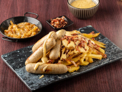 Πατάτες τηγανητές με σάλτσα τσένταρ μπύρας, λουκάνικα και μπέικον!