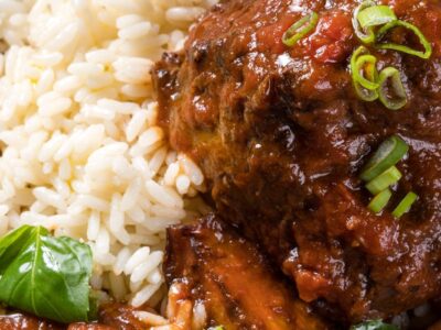 Μοσχάρι κοκκινιστό με μελιτζάνες & πιλάφι.