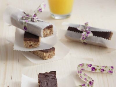 Μπάρες με μέλι, σουσάμι, ξερά σύκα και επικάλυψη σοκολάτας.
