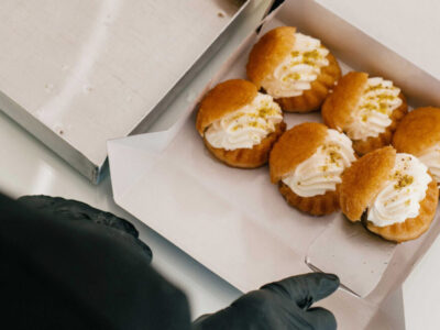 Μους φράουλας ψεκαστό πάνω σε Ντακουάζ φιστικιού με κουλί λευκής σοκολάτας, κονφί φράουλας και γαλλική μαρέγκα.