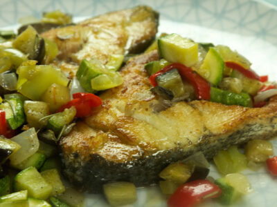 Φέτα κρανιού με πολύχρωμη κομπανία από λαχανικά που σε προϊδεάζουν για ένα πολύ νόστιμο και ελαφρύ γεύμα, χαρακτηριστικό η γευστική φινέτσα.