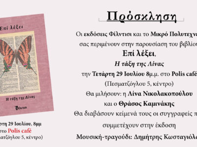 Την Τετάρτη 29 Ιουλίου 8 μμ θα γίνει στο αίθριο του Polis café (Πεσματζόγλου 5, κέντρο) η πρώτη παρουσίαση του βιβλίου «Επί λέξει, ...