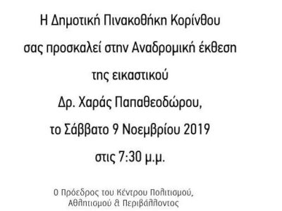 Η Δημοτική Πινακοθήκη Κορίνθου σας προσκαλεί στην Αναδρομική Έκθεση της εικαστικού Δρ. Χαράς Παπαθεοδώρου, το Σάββατο 9 Νοεμβρίου 2019 στις 7.30 μ.μ ΒΙΟΓΡΑΦΙΚΟ: ...