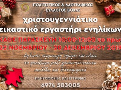 ΧΡΙΣΤΟΥΓΕΝΝΙΑΤΙΚΟ εικαστικό εργαστήρι ενηλίκων από τον Πολιτιστικό & Λαογραφικό Σύλλογο Βόχας, κάθε Παρασκευή, από 22 Νοεμβρίου έως 20 Δεκεμβρίου.