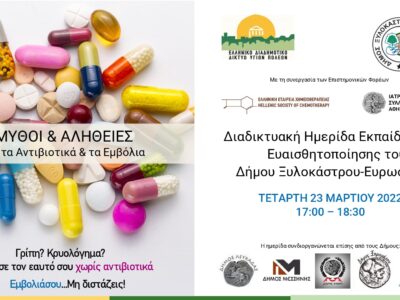 Τετάρτη 23/3/22 και ώρα 17:00-18:30 θα πραγματοποιηθεί η εκδήλωση με θέμα «Μύθοι και Αλήθειες για τα Εμβόλια και τα Αντιβιοτικά.»