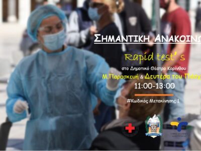 Ενημέρωση των δημοτών ως προς τις ημέρες και ώρες υλοποίησης των rapid test s στο Δημοτικό Θέατρο Κορίνθου