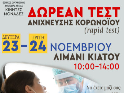 Κιάτο: Δωρεάν Γρήγορα Τεστ ανίχνευσης κορωνοϊού, Δευτέρα 23 και την Τρίτη 24 Νοεμβρίου.