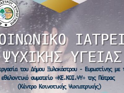 Με ιδιαίτερη ευαισθησία στα κοινωνικά θέματα αλλά και αίσθημα ευθύνης, ο Δήμος Ξυλοκάστρου – Ευρωστίνης λειτουργεί Κοινωνικό Ιατρείο Ψυχικής Υγείας