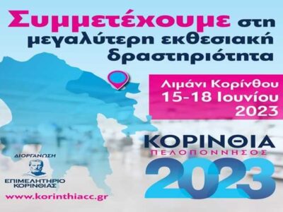 Στη τελική ευθεία οι προετοιμασίες για την εκθεσιακή δραστηριότητα «Κορινθία Πελοπόννησος 2023» «ΚΟΡΙΝΘΙΑ ΠΕΛΟΠΟΝΝΗΣΟΣ 2023» Κόρινθος (λιμάνι Κορίνθου), 15-18 Ιουνίου 2023 ————————- Από την Πέμπτη 15 Ιουνίου έως και την Κυριακή 18 Ιουνίου 2023, η Κόρινθος υποδέχεται την Εκθεσιακή Δραστηριότητα «ΚΟΡΙΝΘΙΑ – ΠΕΛΟΠΟΝΝΗΣΟΣ 2023» που έχει ως στόχο να προβάλλει την καινοτομία, την εξωστρέφεια, την ενεργητικότητα της ελληνικής επιχείρησης και να προάγει την εμπορική ανταγωνιστικότητα. Η φετινή διοργάνωση θα πραγματοποιηθεί στη Χερσαία Ζώνη Λιμένος Κορίνθου ...